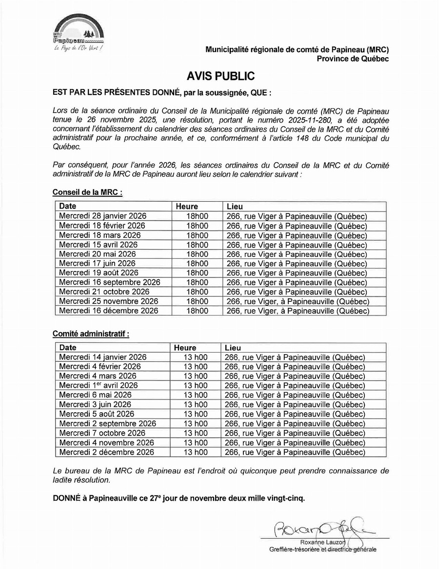 Dates des séances du conseil des maires et des comités administratifs de la MRC pour l'année 2026