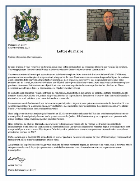 Suite au élection du 2 novembre 2025, une nouvelle équipe se mets en place à la municipalité de MMulgrave-et-Derry.